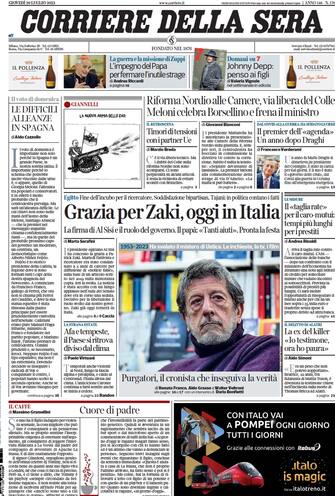 Corriere della Sera: apertura con titolo "Grazia per Zaki, oggi in Italia". La firma di Al Sisi e il ruolo del governo. Il papà: "Tanti aiuti". Pronta la festa. Spazio a "Purgatori, il cronista che inseguiva la verità"