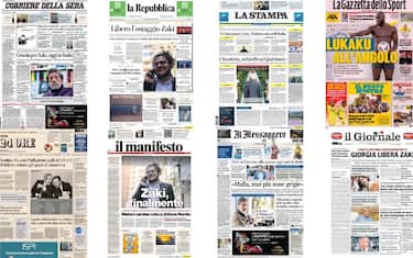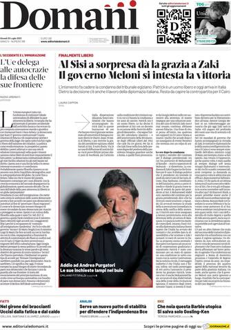 Domani: apertura con titolo "Al Sisi a sorpresa dà la grazia a Zaki. Il governo Meloni si intesta la vittoria". L'intervento fa cadere la condanna del tribunale egiziano: Patrick è un uomo libero e oggi arriva in Italia