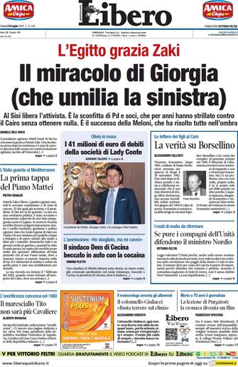 Libero: apertura con titolo "Il miracolo di Giorgia (che umilia la sinistra)". Al Sisi libera l'attivista. E' la sconfitta di Pd e soci, che per anni hanno strillato contro il Cairo senza ottenere nulla. E' il successo della Meloni, che ha risolto tutto nell'ombra