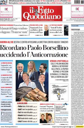 Il Fatto Quotidiano: apertura con titolo "Ricordano Paolo Borsellino uccidendo l'Anticorruzione". Destra e Centro affossano la direttiva contro abuso e tangenti