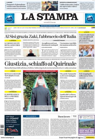 La Stampa: apertura con titolo "Al Sisi grazia Zaki, l'abbraccio dell'Italia". Spazio a "Giustizia, schiaffo al Quirinale". Mattarella firma il ddl sull'abuso di ufficio. Subito dopo la destra boccia la direttiva Ue sulla corruzione