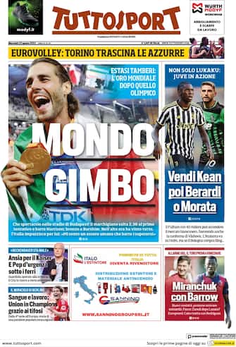 Tuttosport: apertura con titolo "Mondo Gimbo". Estasi Tamberi: l'oro mondiale dopo quello olimpico. Spazio a "Juve, vendi Kean. Poi Berardi o Morata"