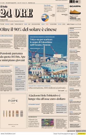Il Sole 24 Ore: apertura con titolo "Oltre il 90% del solare è cinese". Spazio a "Tokyo sta per scaricare le acque di Fukushima nell'Oceano. Proteste"