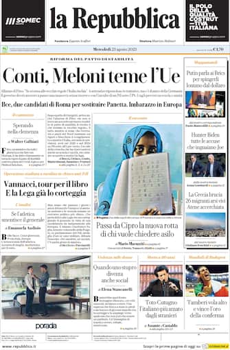 La Repubblica: apertura con titolo "Conti, Meloni teme l'Ue". Allarme di Fitto: "Se si ritorna alla vecchie regole, l'Italia rischia". Spazio a "Passa da Cipro la nuova rotta di chi vuole chiedere asilo"