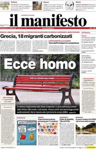 Il Manifesto: apertura con titolo "Ecce homo". Le violenze degli uomini sulle donne si ripetono. La destra farnetica di tour delle vittime nelle scuole e castrazione. Avanza anche una nuova legge penale sui femminicidi. Ma la risposta solo repressiva ha sempre fallito