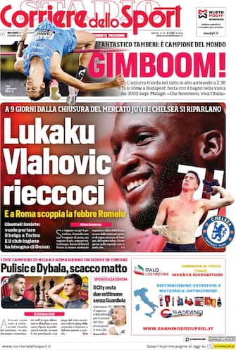 Corriere dello Sport: apertura con titolo "Lukaku, Vlahovic rieccoci". A 9 giorni dalla chiusura del mercato, Juve e Chelsea si riparlano. E a Roma scoppia la frebbe Romelu. Spazio a "Gimboom!". L'azzurro vince il titolo mondiale nel salto in alto