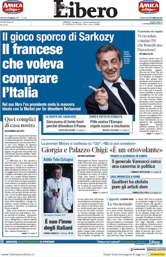 Libero: apertura con titolo "Il gioco sporco di Sarkozy: il francese che voleva comprare l'Italia". Nel suo libro l'ex presidente svela la manovra ideata con la Merkel per far dimettere Berlusconi