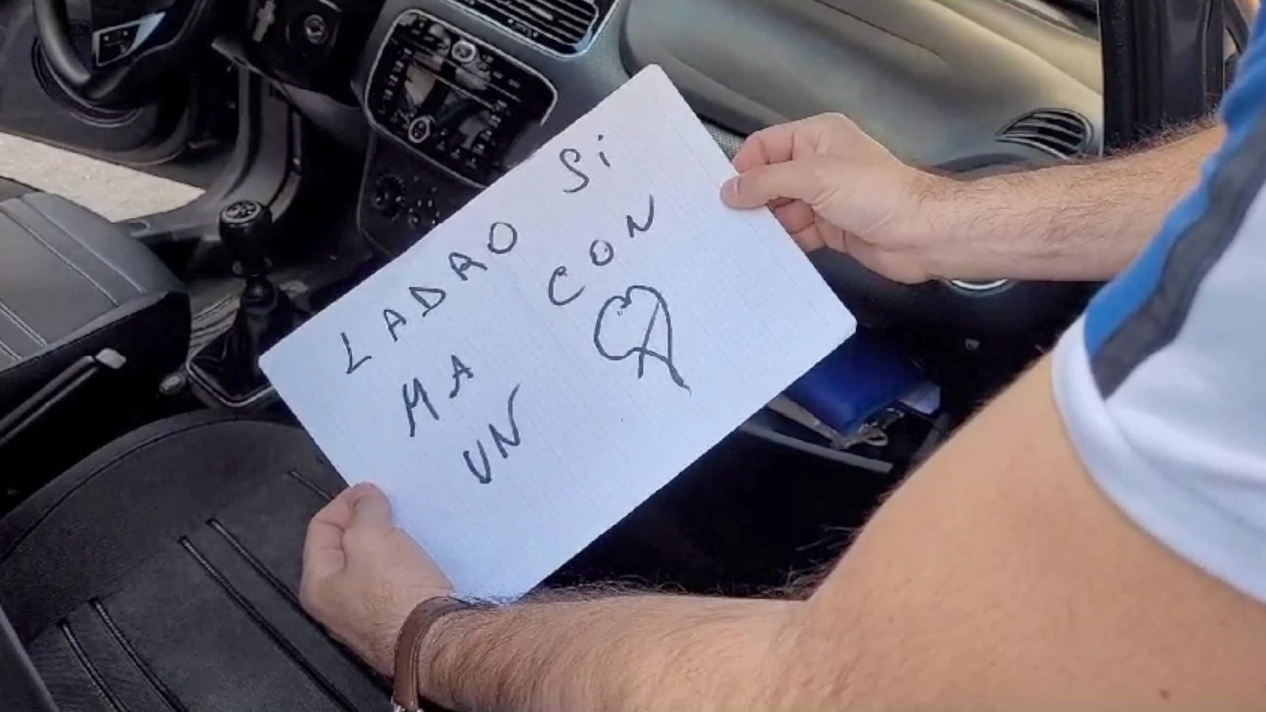 "Ladro sì, ma con un cuore": questo il testo del biglietto lasciato all'interno della Fiat Punto rubata ad una coppia di novelli sposi e ritrovata questa mattina a Foggia. A notare l'auto, parcheggiata in una via della stazione ferroviaria di Foggia in un punto in cui occludeva l'ingresso condominiale, è stato un carabiniere libero dal servizio, che ha segnalato l'anomalia alla polizia locale, chiedendone l'intervento.