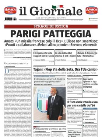 Il Giornale apre con "Strage di Ustica. Parigi patteggia". Spazio anche al forum di Cernobbio: "Tajani: 'Flop Via della Seta, ora l'Ue cambi"
