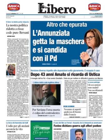 "L'Annunziata getta la maschera e si candida con il Pd" è l'apertura di Libero. Taglio basso per Ustica: "Dopo 43 anni Amato si ricorda di Ustica"