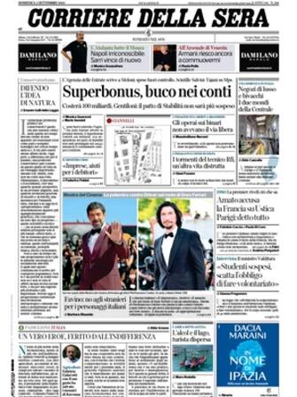 "Superbonus, buco nei conti" è l'apertura del Corriere della Sera. Tagli basso per la Mostra del Cinema di Venezia: "La polemica contro Driver nel ruolo di Enzo Ferrari"