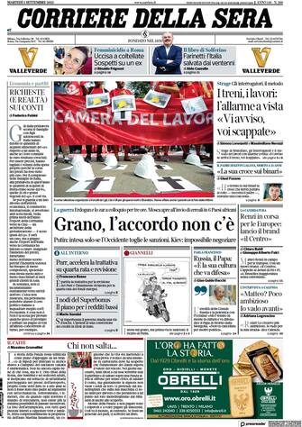 Corriere della Sera: apertura con titolo "Grano, l'accordo non c'è". Putin: intesa solo se l'Occidente toglie le sanzioni. Kiev: impossibile negoziare