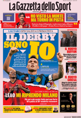 La Gazzetta dello Sport: apertura con titolo "Il derby sono io". Lautaro specialista e primatista. Spazio a "Leao, mi riprendo Milano"