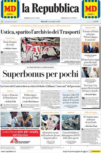 La Repubblica: apertura con titolo "Superbonus per pochi". Conti a rischio e deficit oltre il 3,7% sono l'incubo di Meloni. La linea del Tesoro è tagliare per evitare scontri con Bruxelles