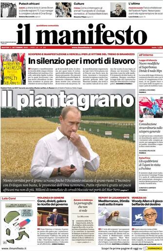 Il Manifesto: apertura con titolo "Il piantagrano". Niente corridoi per il grano ucraino finché l'Occidente ostacola il grano russo. L'incontro con Erdogan non basta, le promesse dell'Onu nemmeno. Putin rifornirà gratis sei pesi africani ma non di più