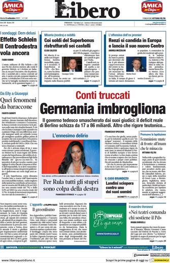 Libero: apertura con titolo "Germania imbrogliona". Il governo tedesco smascherato dai suoi giudici: il deficit reale di Berlino schizza da 17 a 86 miliardi. Altro che rigore teutonico