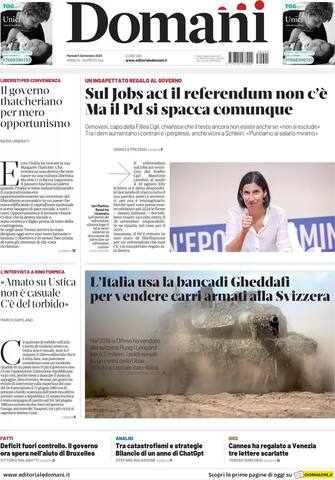 Domani: apertura con titolo "Sul Jobs act il referendum c'è. Ma il Pd si spacca comunque". Spazio a "L'Italia usa la banca di Gheddafi per vendere carri armati in Svizzera"