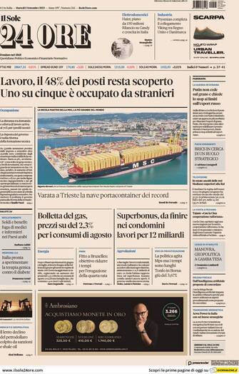 Il Sole 24 Ore: apertura con titolo "Lavoro, il 48% dei posti resta scoperto. Uno su cinque è occupato da stranieri"