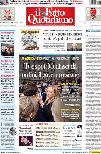 Il Fatto Quotidiano: apertura con titolo "Tv e spot: Mediaset dà ordini, il governo esegue". Emendamenti al Freedom Act europeo