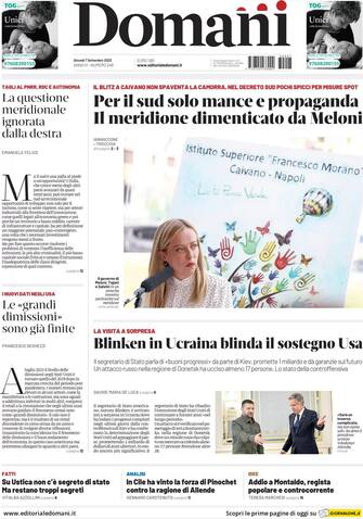 Domani: apertura con titolo "Per il sud solo mance e propaganda. Il meridione dimenticato da Meloni"