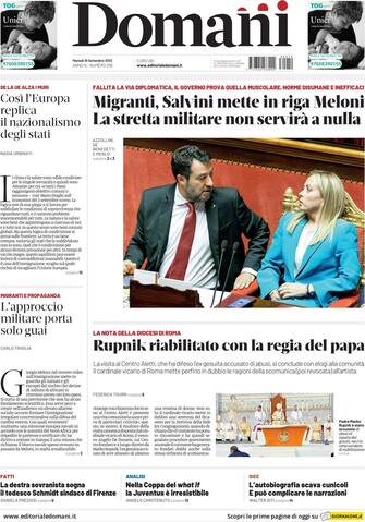 - Apertura con titolo "Migranti, Salvini mette in riga Meloni. La stretta militare non servirà a nulla"