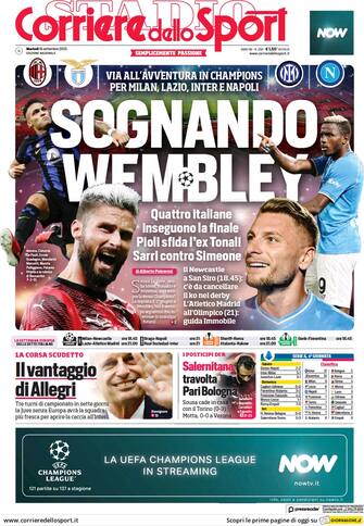 - Apertura con titolo "Sognando Wembley". Quattro italiane inseguono la finale. Pioli sfida l'ex Tonali. Sarri contro Simeone