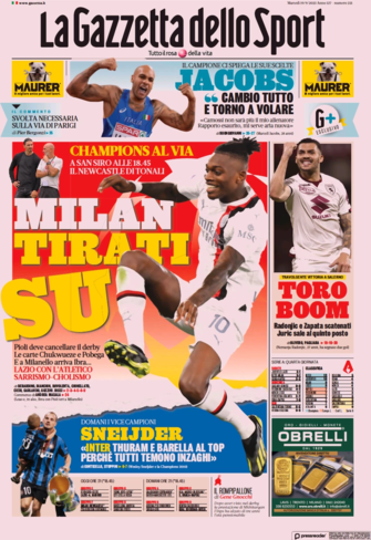 - Apertura con titolo "Milan tirati su". Pioli deve cancellare il derby. Le carte Chukwueze e Pobega. E a Milanello arriva Ibra