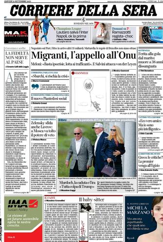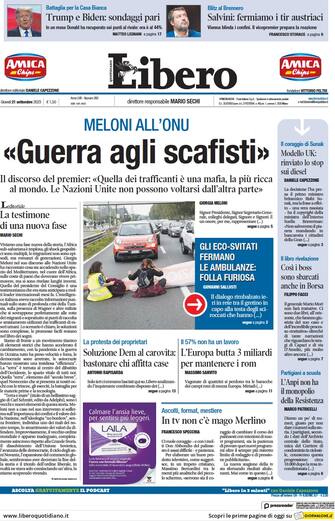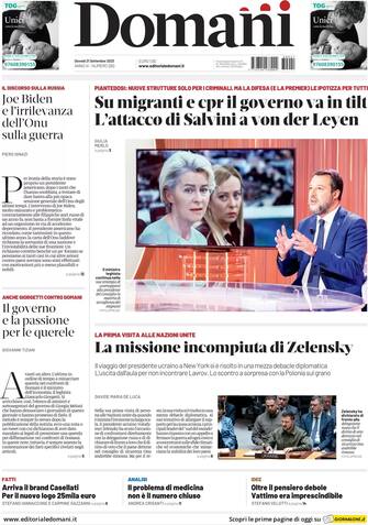 - Apertura con titolo "Migranti, 6 italiani su 10 ora bocciano il governo". Meloni all'Onu: inseguire i trafficanti ovunque. Il Viminale: Cpr obbligatori