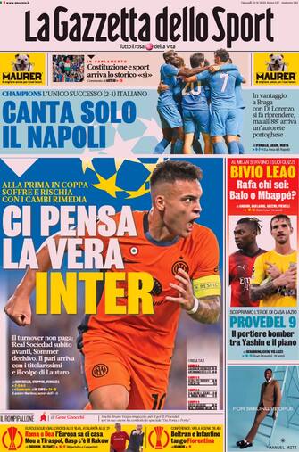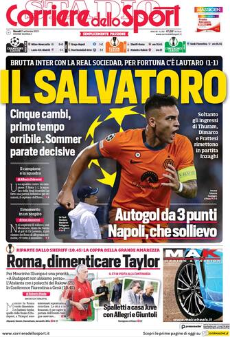 - Apertura con titolo "Ci pensa la vera Inter". Alla prima in Coppa soffre e rischia. Con i cambi rimedia. Il turnover non paga: Real Sociedad subito avanti, Sommer decisivo. Il pari di Lautaro Martinez arriva a 3' dalla fine