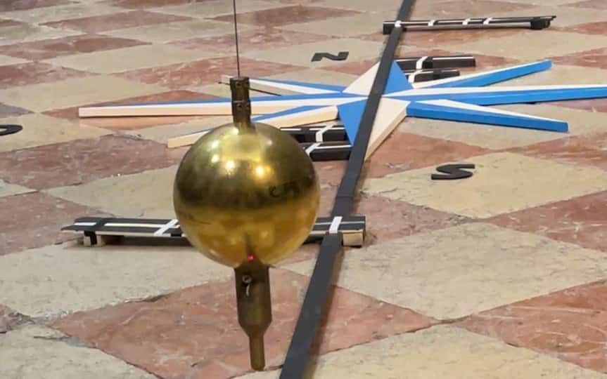 Il pendolo di 28 chili è stato appeso a 65metri di altezza, alla sommità dlela cupola maggiore. Con il variare del suo piano di oscillazione, il pendolo indica in maniera tangibile il movimento della Terra.