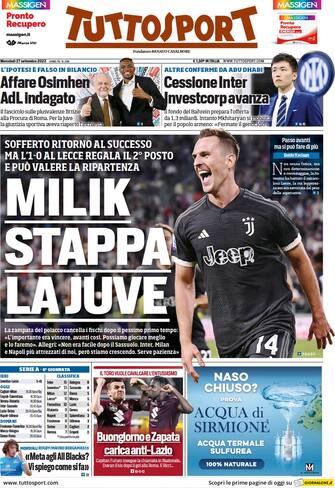 - Apertura con titolo "Milik stappa la Juve". Sofferto ritorno al successo ma l'1-0 al Lecce regala il 2° posto e può valere la ripartenza