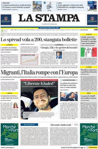 - Apertura con titolo "Migranti, l'Italia rompe con l'Europa". Ue pronta all'accordo, ma Piantedosi blocca tutto. Il sospetto della premier: regia tedesca contro di noi. Spazio a "Lo spread vola a 200, stangata bollette"