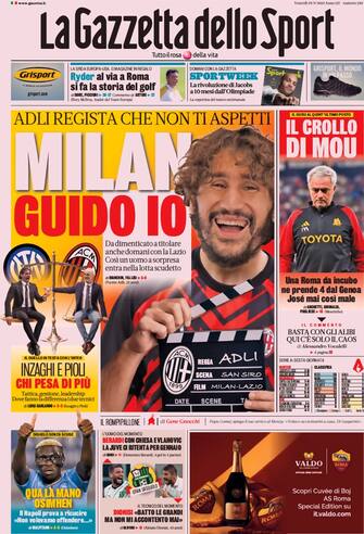 - Apertura con titolo "Milan, guido io". Adli regista che non ti aspetti. Spazio a "Il crollo di Mou". La Roma perde 4-1 a Marassi contro il Genoa