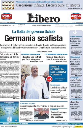- Apertura con titolo "Germania scafista". Lo stupore di Palazzo Chigi: mentre si discute il patto sull'immigrazione al largo della Libia circolano quattro navi Ong battenti bandiera tedesca
