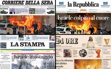 Tutti i quotidiani di oggi riportano in prima pagina la notizia dell'attacco di Hamas a Israele e della risposta di Netanyahu con la rappresaglia su Gaza. Si parla anche del caso della giudice Apostolico e della manifestazione a Roma per il salario minimo
