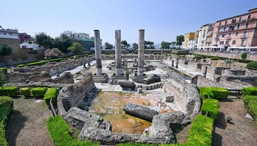 Si trova nel Comune di Pozzuoli: era il Macellum, cioè il mercato pubblico della antica città Romana. Viene chiamato Tempio di Serapide perché nel 1750, durante i primi scavi, fu rinvenuta una statua del dio egizio Serapide. Nei secoli è diventato il simbolo del bradisismo flegreo: negli anni Sessanta, ad esempio, il suo pavimento si trovava al di sotto del livello del mare. Oggi invece il pavimento si trova sopra il livello del mare. Per secoli, anche dal punto di vista scientifico, ha rappresentato un indice importante per misurare l’innalzamento o l’abbassamento del suolo conseguenti al bradisismo. La struttura, che si trova vicinissimo al porto, risale al I-II secolo d.C., ha un cortile a pianta quadrata con un porticato. Vi si affacciano le botteghe, con una conformazione simile ad altri mercati pubblici antichi. Ma in qualche modo, “grazie” al bradisismo che lo ha tenuto sommerso per molto tempo, il Tempio di Serapide è tra i mercati meglio conservati. Al momento le visite sono sospese, ma è possibile vederlo dall’esterno.