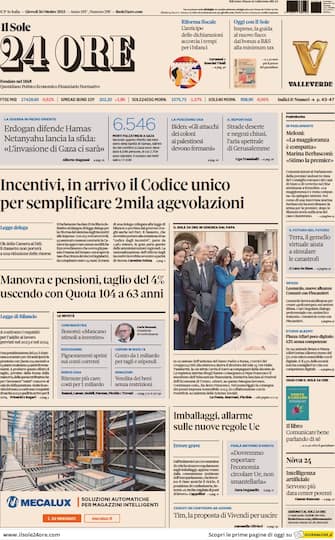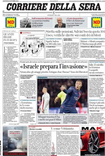 Aperture dedicate alle dichiarazioni di Erdogan: "Sto con Hamas. No terroristi, ma patrioti". Spazio alle intenzioni di Netanyahu di invadere la Striscia. E spazio anche alle parole di Marina Berlusconi: "Retroscena inventati, stimo la Meloni". Sui quotidiani sportivi si celebra Mbappé, che trascina il Psg al 3-0 sul Milan