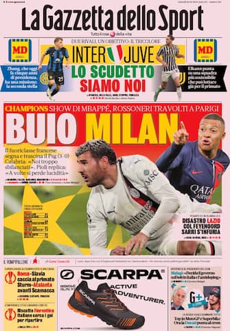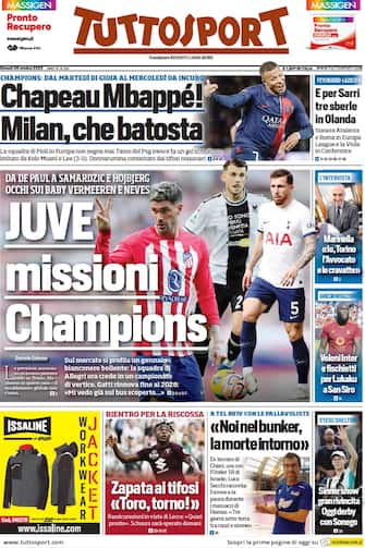 - Apertura con titolo "Buio Milan". Mbappé segna e trascina il Ps g (3-0). Calabria: noi troppo sbilanciati. Pioli replica: a volte si perde lucidità