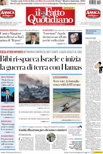 - Apertura con titolo "Bibi ri-spacca Israele e inizia la guerra di terra con Hamas". Netanyahu contro gli 007 e Gantz. A Gaza assalti al cibo