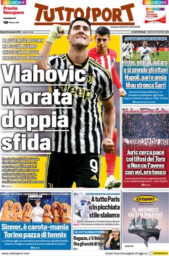 - Apertura con titolo "Vlahovic-Morata doppia sfida". Spazio a "Inter, entra Lautaro e si prende gli ottavi. Napoli, pari ansia"