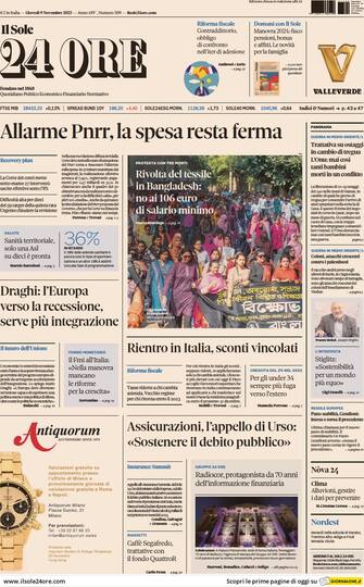 - Apertura con titolo "Allarme Pnrr, la spesa resta ferma". Spazio a "Rivolta del tessile in Bangladesh: no ai 106 euro di salario minimo"