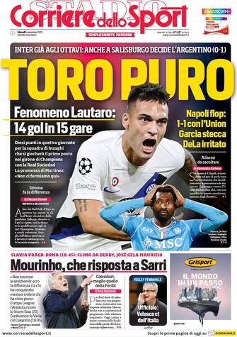 - Apertura con titolo "Inter, sempre lui". Champions: nerazzurri già agli ottavi con l'1-0 in casa del Salisburgo. Pari Napoli contro l'Union Berlino