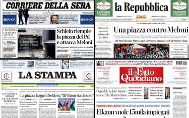 - “La piazza larga di Schlein: 'Il Pd non sta da solo'”, è il titolo di apertura in riferimento alla manifestazione a Roma contro il governo Meloni. Nel taglio centrale la guerra in Medio Oriente con la condizione critica degli ospedali a Gaza