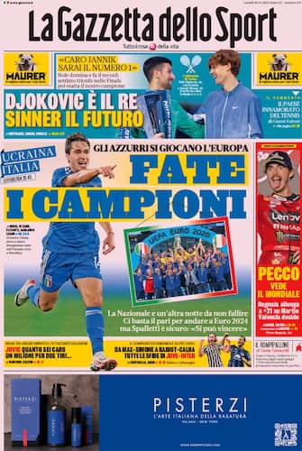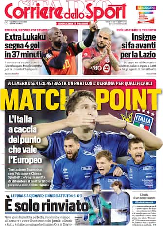 - Apertura con titolo "Match point". L'Italia a caccia del punto che vale l'Europeo. Tentazione Scamacca con Politano e Chiesa. Spalletti: "Voglia matta di difendere il nostro titolo"