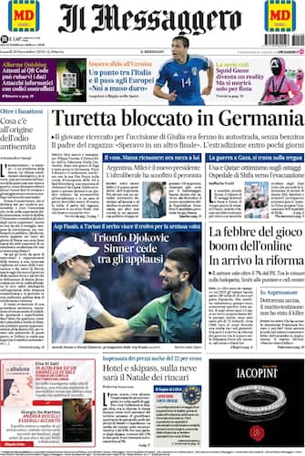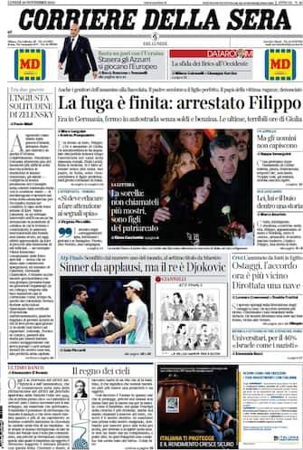 Apertura dei quotidiani odierni dedicata all'arresto in Germania di Filippo Turetta, l'ex fidanzato di Giulia Cecchettin accusato di omicidio. Era fermo in autostrada, a luci spente, senza soldi e benzina: ha accettato l'estradizione. Sui giornali sportivi spazio alla finale persa da Sinner contro Djokovic, alle Atp Finals di Torino, e alla gara di stasera dell'Italia contro l'Ucraina: basta un pari per Euro 2024