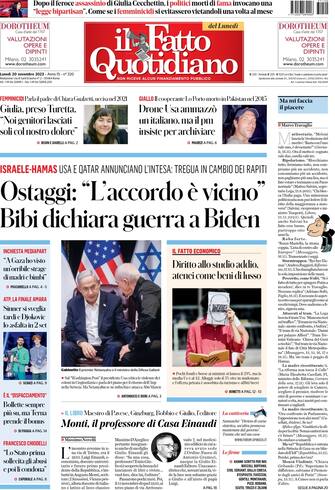 - Apertura con titolo "Ostaggi: l'accordo è vicino. Bibi dichiara guerra a Biden". Usa e Qatar annunciano l'intesa: tregua in cambio di rapiti
