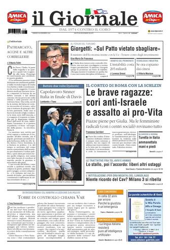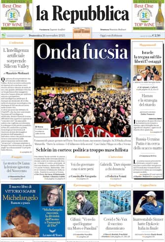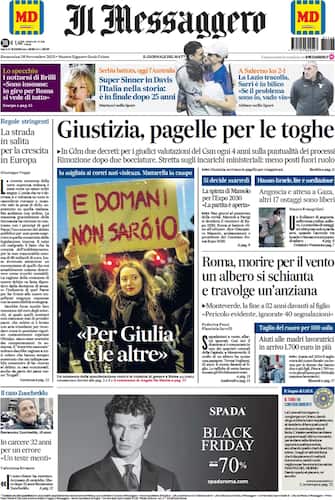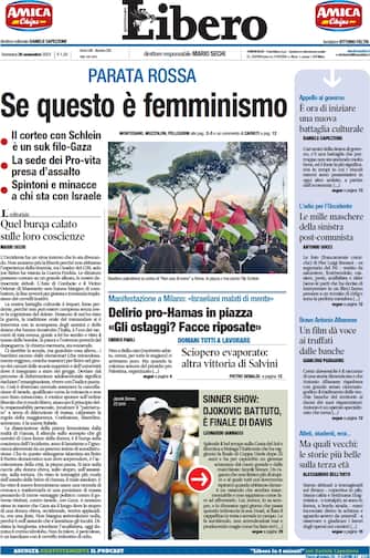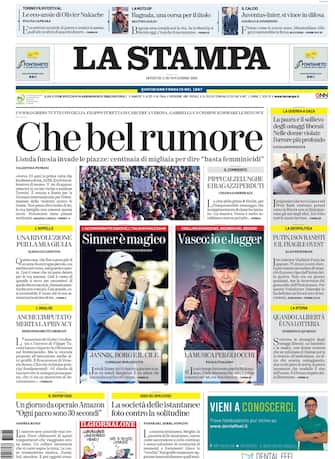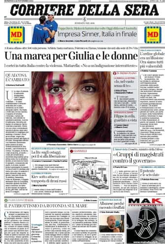 Aperture dei quotidiani sull'onda Fucsia nelle piazze italiane. A Roma in 500mila per urlare basta femminicidi. Non solo donne, ma anche uomini e famiglie. Sui quotidiani sportivi spazio alla vittoria in semifinale di Davis dell'Italia contro la Serbia grazie a Jannik Sinner: oggi finale contro l'Australia