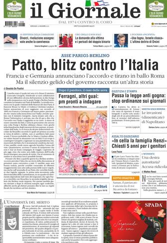 - Apertura con titolo: "Patto, blitz contro l'Italia. Francia e Germania annunciano l'accordo e tirano in ballo Roma. Ma il silenzio gelido del governo racconta un'altra storia"