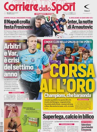 - Apertura con titolo: "Champions, che baraonda. Grande equilibrio tra quota 28 e 25: il salto del Bologna, i segnali di Osi, la scalata della Viola, i numeri di Gasp e Mou. Ma anche la Lazio, a 21, ci crede"