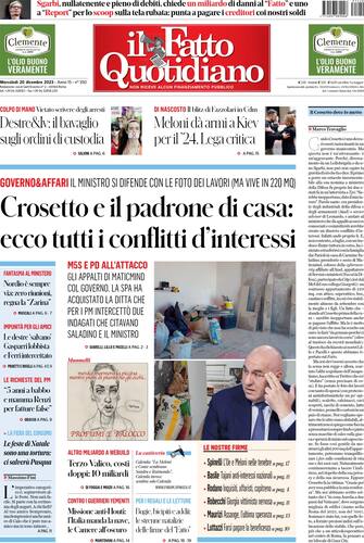 - Apertura con titolo: "Crosetto e il padrone di casa: ecco tutti i conflitti d'interessi. Gli appalti di Maticmind col governo. La Spa ha acquistato la ditta che per i pm intercettò due indagati che citavano Saldino e il ministro"